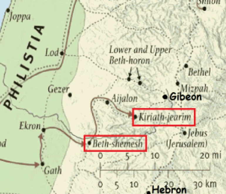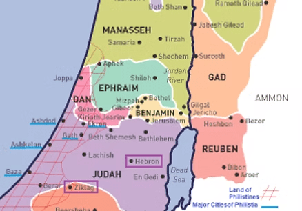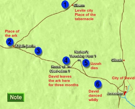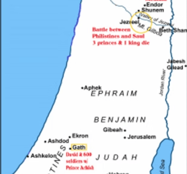 In this map, one can see how far apart David was from Saul when that happened. Saul was killed, along with his sons, in the battle of Mount Gilboa. The Philistines, including warriors from Gath, had surrounded Saul’s army; and Saul sought out a medium, who put him in touch with the recently deceased Samuel. The ghost of Samuel said Saul would be with him soon. Thus, after Saul received word that all of his sons had fallen in battle, he committed suicide.