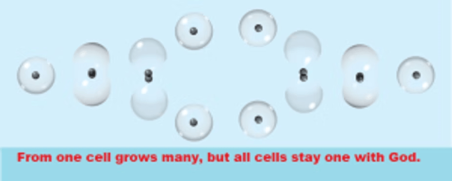 See this mirror image as the normal dividing of cells as life that leads to mortal death. The reverse becomes the joining of all into one again, as eternal life.
