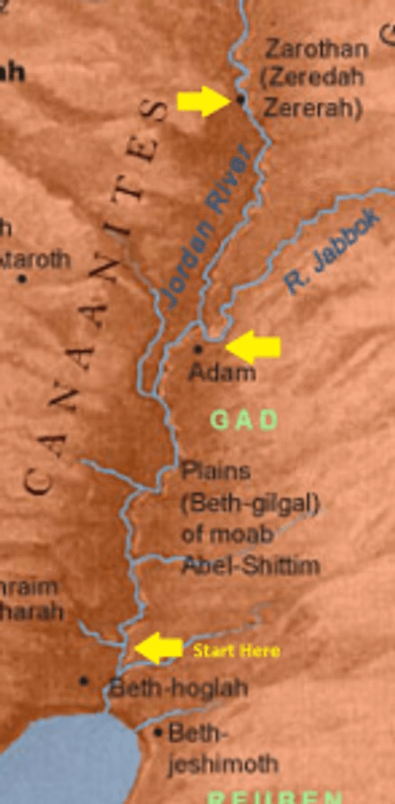 This map shows the physicality of what is stated. The Wadi Nimrin represents a dry ravine during the dry season, but since the text states, “Now the Jordan overflows all its banks throughout the time of harvest,” the wadi would have been flowing a lot of water into the Jordan, causing it to overflow its banks. Just north of Adam is the Jabbok River, which flows into the Jordan, and just to the south is where the Wadi Tirzah had its confluence. The sheer size of this area affected (15 miles roughly) must be seen as a necessary space that could accommodate a great number of Israelites. If that many who were filled with the Holy Spirit of God were ready along the banks of the Jordan, awaiting Joshua’s commands of the LORD, the feet touching far away to the south would have started a backwards flow northward.