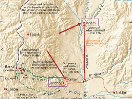 When we are then told the extent of the cessation of waters flowing, “rising up in a single heap far off at Adam, the city that is beside Zarethan,” this needs to be grasped both physically (actual locations) and spiritually (why those places bore those names). Here is a map that someone who has written about Joshua has posted online: