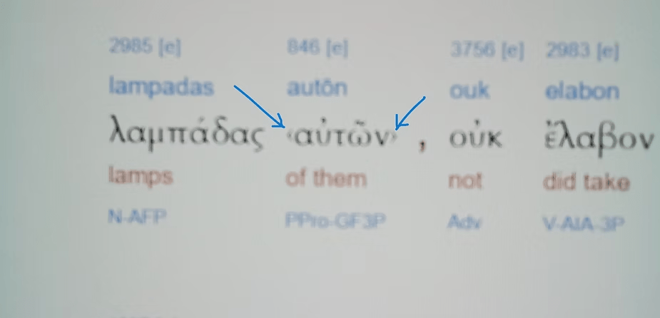 Bible Hub Interlinear places a period mark at the end of verse seven, making verse eight become a new line of thought being presented; but it does not begin with a capitalized hai, which is the nominative feminine plural ‘article’ seen prior, which translates as “these,” referring to all the souls who were given “torches, lanterns, or lamps” upon their engagement to Yahweh – the “bridegroom.” Here, we read “these now” or “these moreover” (a repeated use of de) are not “the ones” or “those” who experienced the ecstasy of Yahweh’s presence touching “their souls,” calling “them souls” to “Come out” and “meet his soul.” In this regard, “these moreover” are the “foolish, heedless, and stupid” ones, who have become alerted that the “bridegroom” is there, by the actions of “them wise and thoughtful.” Thus, “these moreover stupid to those thoughtful spoke” (eipan) in the third-person aorist indicative active, “they (the stupid) commanded” “to those wise.”