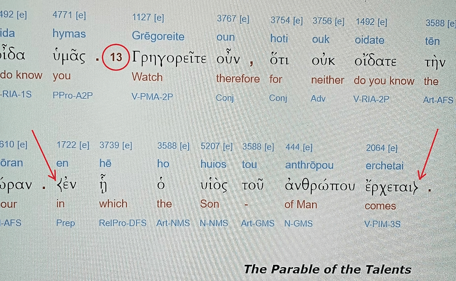 These words then say, “inside to whom this son of this of man he comes.” Bible Hub Interlinear then places a period mark outside the ending bracket, as a way of stating this final instruction does not end. That is a statement of eternal presence in Saints forevermore, as all those souls will have married Yahweh and received in that Spiritual union “this son of this of man,” which is Jesus … the one telling this parable. The period mark should then make all the disciples hearing this parable sit up and wonder, “I thought Jesus was the Son of man. How does he get into these virgins?”