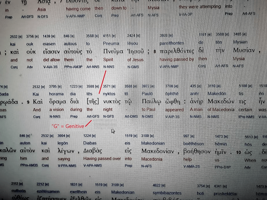 By realizing this stated in the prior three verses, with the three having reached “Troas,” verse nine begins with a capitalized “Kai,” which states great importance is to follow and one should pay close attention to that stated. Following that marker word, we read, “a vision on account of [of this],” where there are brackets placed around the word Genitive article “tēs,” which translates as “of this.” The brackets become a statement about “this” inability to “speak the word,” which the three had faced prior.