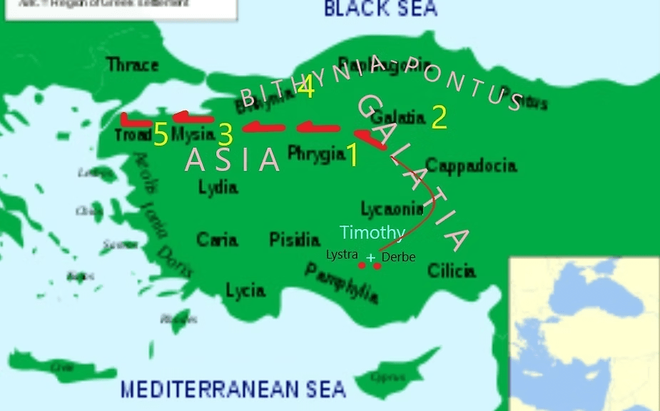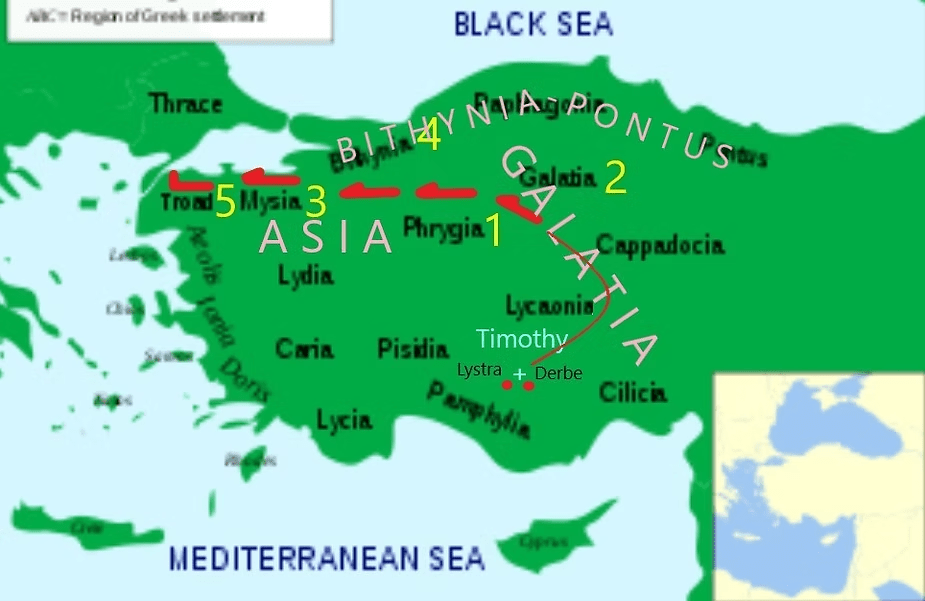 This means when they entered the region of Asia, having left Galatia, they were at a loss for what to say, as far as teaching Hebrew Scripture. As they would go from Jewish settlement to Jewish settlement, each Sabbath they would enter a synagogue and hear the selected readings for that day. Because the texts read as “Sacred” of “Holy,” none of the three was led by the “Spirit” that possessed their souls to add anything that would further explain that which was “Holy” in writing. This says they got as far as Mysia and were not moved to preach; so, they considered going north, into Bithynia, but the presence of Jesus within each of their souls said, “No.”