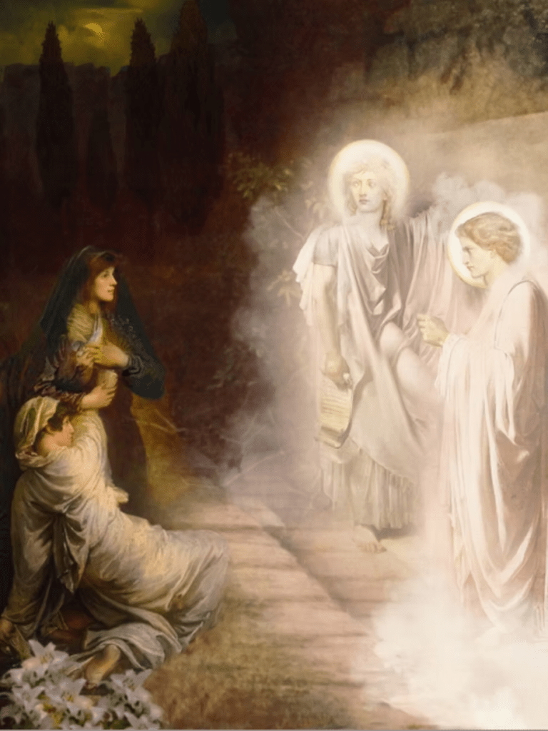 Mary saw two angels, where “angels” are spiritual entities that are not physical. The number “two” must always be read in Scripture as a duality in self – where “two angels” become Mary witnessing the “two spirits” that then possessed her being: her soul and the soul of Jesus – together as one. That then leads to us reading, “she turned around and saw Jesus standing there, but she did not know that it was Jesus.” She experienced Jesus in her own soul for the first time and did not recognize his soul as hers. Jesus’ soul had remained to enter the souls of his closest followers; and, Mary Magdalene was one. Thus, the “two angels” were the souls of Mary meeting the soul of Jesus within. This is the truth of “resurrection,” where Mary was dead before that moment; but then when she saw the invisible truth, she was herself “raised from the dead.”
