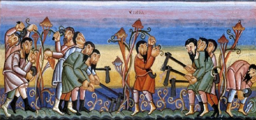 Because this landowner possessed a vineyard, this is metaphor for Jesus being the good vine (“I am the true grapevine, and my Father is the gardener” – John 15:1). As grapevines are cut back after each season, allowing for new growth each year, the roots are those coming from “the stump of Jesse” (Isaiah 11:1 – “A shoot will come up from the stump of Jesse; from his roots a Branch will bear fruit.”) The “landowner” is therefore a metaphor for God, with the “true grapevine” being the source for those feeding on the body and blood of Jesus the Messiah, and the grapes being harvested representing the souls saved. The good workers are thus true Christians, as devoted priests filled with the Holy Spirit, which the disciples would become (as well as all others they would affect). However, not all workers are good.