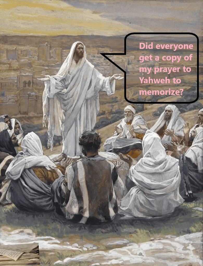 In all pronoun usage in this reading selection, words reflecting “you” or “yourself,” in the singular and the plural number, must be read as Jesus not speaking to human ears, but speaking to their “souls,” where “you” or “him” is an indication of a living flesh, which is only alive due to the presence of a “soul.” Jesus “was born” to enter “within” the souls of those seeking divine marriage to Yahweh, bring to them “an opportunity to become a known one” who will be heard spiritually communicating with the Father. As such, the disciples did not watch Jesus go off into the wilderness or a mountain cliff to pray, causing the disciples to ask him how to find such a place for themselves to pray. Jesus was seen to be obviously in a state of divine communication, much like a Zen master would be seen in a lotus position, eyes closed, fingers in a particular position, thereby known to be in prayer – so “Do not disturb.”