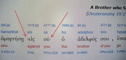 Jesus had stated generically the potential of a sinner “among you” (“<eis se>“), with the lesser than left angle bracket being a signal of one found to be less “in the name of Jesus” than the rest. Again, this is found in the analysis of Matthew 18:15. [Ezekiel 33:7-11]