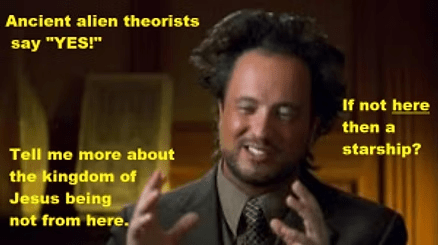 When Jesus then said, “My kingdom is not of this world,” he admitted that he had allowed others, in one way or another, to hear him talk about a kingdom that he possessed. If cable TV and The History Channel had existed back then, and if Pilate had been a fan of Ancient Aliens, undoubtedly he would have been intrigued by Jesus’ answer. He might have wondered what ancient alien theorist would say about an “out of this world kingdom.”